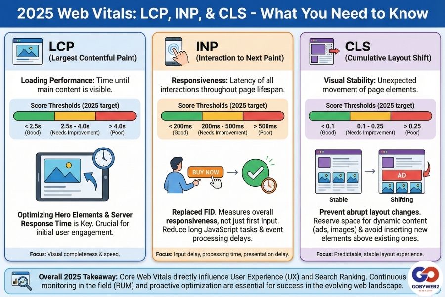 - Core Web Vitals (LCP - Largest Contentful Paint, INP - Interaction to Next Paint, CLS - Cumulative Layout Shift)